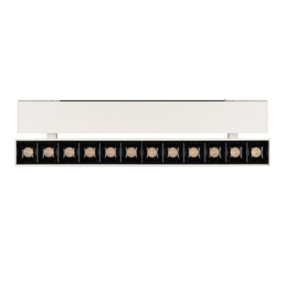 Светильник поворотный для магнитных треков шириной 45мм, 12Вт. Цвет свечения ТЕПЛЫЙ 3000K, световой поток 707лм, угол 15°, CRI>,90. Корпус прямоугольный, металл, цвет белый, IP20. Размеры LxWxH 322x35x92.5мм. Входное напряжение DC24V, мощность 12Вт. Драйвер DС24V/AC230V поставляется отдельно. Диммируется только с 026407, 027633.