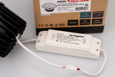 Встраиваемый круглый светильник с наклоняемой осью, угол 60° / 25Вт / ТЕПЛЫЙ БЕЛЫЙ 3000K / светодиод 1x25W CREE / 1950 лм. Белая лицевая панель. Питание AC110-240V, драйвер в комплекте 600mA 34-50V). Размеры DxH: 150х115мм, отверстие для установки 128мм.