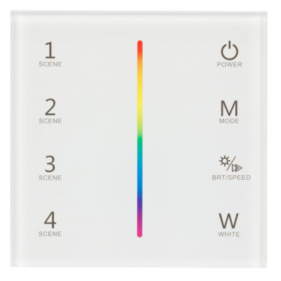 Встраиваемая сенсорная стеклянная панель 2.4 ГГц, цвет белый. Для управления светодиодными RGBW источниками света (ШИМ). Управление цветом с помощью сенсорной полосы. Работает в режиме master/slave и может выполнять функцию независимого контроллера. Питание/рабочее напряжение 12-24VDC, максимальный ток 3A на канал, 4 канала, максимальная мощность 144-288W. Габариты 86х86х37 мм. Панель совместима с пультами и контроллерами серии SMART.