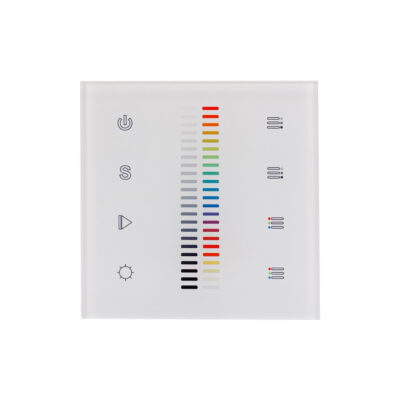 Встраиваемая стеклянная белая Touch-панель с сенсорным слайдером, 4 зоны, 1-2 зона DIM, 3-4 зоны RGB. Управление – по радиоканалу (совместимы с контроллерами SR-1009x). Питание 220 В. Размер 86x86x29 мм. Аналогичные по дизайну панели в серии SMART (устройства не совместимы).